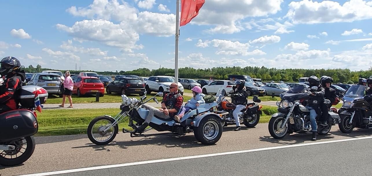 Om 11.30 uur gaf Grizzly Bikersforall een briefing over het rijden op en naar het TT-cirquit. Toen kregen we het startsein dat we gingen vertrekken. Fenna zat al op de trike en moeders achterop de motor bij Michel van Oxalis.